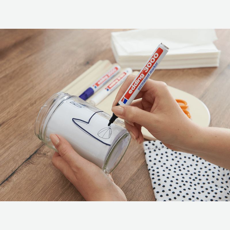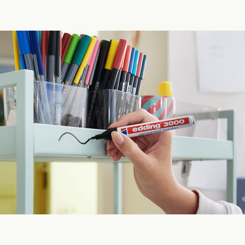 CUANDO SE TRATA DE ROTULAR, MARCAR O RESALTAR ALGO CLARAMENTE, EL MARCADOR PERMANENTE EDDING 3000 ES LA ELECCIÓN CORRECTA. EL MARCADOR SE PUEDE UTILIZAR PARA MARCAR DE FORMA DURADERA EN CASI TODO TIPO DE SUPERFICIES, DESDE FOTOGRAFÍAS HASTA PLÁSTICO Y VIDRIO, PASANDO POR MADERA, PIEDRA, CUERO O METAL. ES EL AYUDANTE PERFECTO PARA EL TRABAJO DIARIO Y SE ADAPTA A CUALQUIER COCINA, ESTUDIO Y TALLER.EL CLÁSICO ENTRE LOS ROTULADORES PERMANENTES TIENE UNA PUNTA DE BALA ROBUSTA Y DE TAMAÑO MEDIANO, PERFECTA PARA TODO TIPO DE MARCADO, TAREAS ORGANIZATIVAS Y CREATIVIDAD ARTÍSTICA.